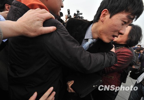 3月3日下午,政协委员刘翔在北京人民大会堂外突破重围,去出席全国政协十一届三次会议开幕式。