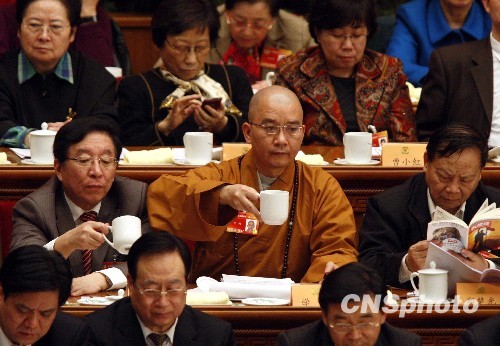 3月3日下午,全国政协十一届三次会议在北京人民大会堂开幕,全国政协委员、中国佛教协会副会长学诚出席。中新社发 张宇 摄