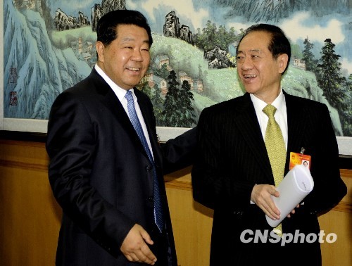 3月6日,全国政协主席贾庆林与九三学社中央主席韩启德交流。当日,全国政协主席贾庆林来到全国政协农工党、九三学社联组讨论现场,与委员们共商国是,并听取部分委员发言。中新社发 廖攀 摄