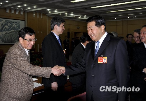 3月6日,全国政协主席贾庆林来到全国政协农工党、九三学社联组讨论现场,与委员们共商国是,并听取部分委员发言。中新社发 廖攀 摄