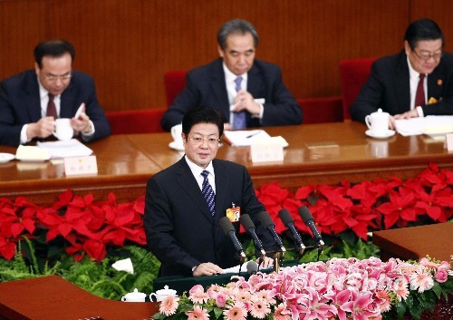 3月8日,十一届全国人大三次会议在人民大会堂举行第二次全体会议。受全国人大常委会委托,全国人大常委会副委员长王兆国向大会作关于选举法修正案草案的说明。中新社发 杜洋 摄