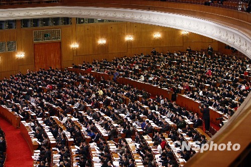 3月9日,第十一届全国人民代表大会第三次会议在人民大会堂举行第三次全体会议,代表听取全国人大常委会委员长吴邦国作全国人大常委会工作报告。中新社发 杜洋 摄