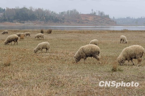 3月25日,贵州省威宁县草海因持续旱情,水域面积减少约3成,大片“海底”土地变成旱地,当地村民开始在退水区放牧绵羊。草海是贵州省最大的天然淡水湖,是以高原湿地生态系统为特色的国家级自然保护区。中新社发 曹多然 摄
