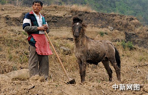 3月28日,记者走访贵州兴义市乌沙镇时,遇到一位在田地里遛马的农民,因为缺乏饮水和饲料,这位农民只得将马匹牵到田间觅食。作 者:曹多然