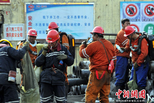 4月6日,几名疲惫的救援队员在小憩。华晋焦煤公司王家岭矿透水事故进入第十天,救援队员在井下发现5名遇难者遗体。此前,153名被困人员中已有115人成功获救并得到精心救治。中新社发 刘冬 摄