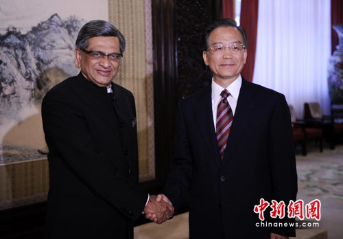 4月7日,中国国务院总理温家宝在中南海紫光阁会见了印度外长克里希纳。中新社发 廖攀 摄