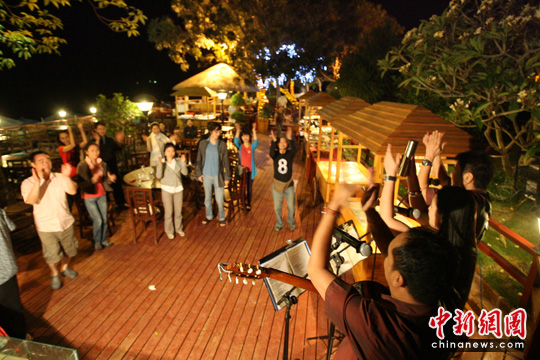 一群菲律宾民间歌手在春季为海南三亚街头演唱。随着早先国务院发布的《关于推进海南国际旅游岛建设发展的若干意见》,三亚作为中国热带旅游度假目的地日渐热络,众多东南亚“淘金者”瞄准三亚旅游商机登录海南。中新社发 杨可佳 摄