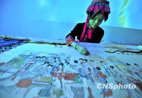 5月8日,上海世博会中国广西馆的绣花姑娘,表演她精心绣制的《红楼梦》。中新社发 贾国荣 摄