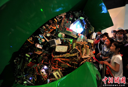 5月,上海世博会中国天津馆里,一个被工业垃圾撑开了裂缝的地球雕塑,引导观众理解未来城市的环保重任。中新社发 贾国荣 摄