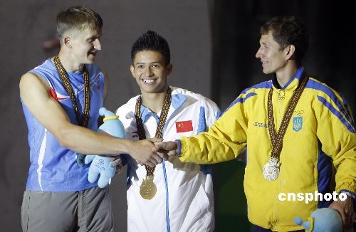 7月18日,在高雄举办的第八届世运会上,中国选手钟齐鑫(中)在男子攀岩竞速赛上摘得金牌。中新社发 杜洋 摄