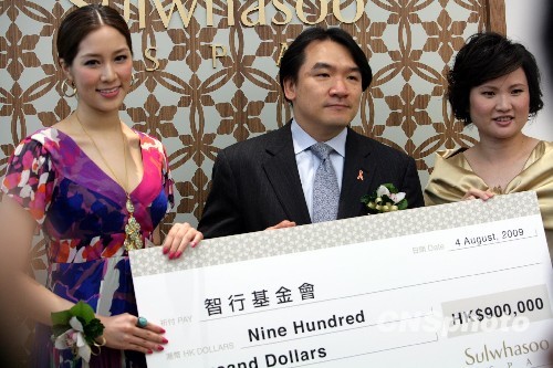 八月四日,嫁入豪门的艺人徐子淇[左]出席一家韩国品牌护肤店开幕典礼,以“智行基金会”慈善大使身份联同其他嘉宾,捐出总值九十万港元作慈善用途。中新社发 洪少葵 摄