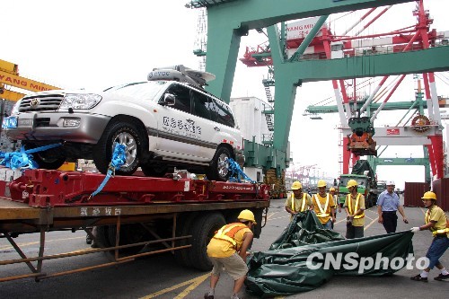 8月31日上午,由中国移动无偿提供的三台应急通信车运抵高雄港。中移动与台湾远传电信的合作救灾举措,创下两岸电信业合作的首例。中新社发 董会峰 摄