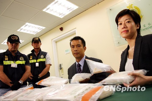九月十一日,香港海关召开记者会,海关毒品调查课监督黄瑞祥、助理监督何佩珊[右]展示十日晚在沙田捣破一个毒品储存及分销中心的毒品。行动中海关拘捕一名二十七岁香港男子,并缴获十五公斤可卡因及三百七十四克俗称“霹雳”的可卡因毒品,市值约一千四百三十万元。中新社发 洪少葵 摄
