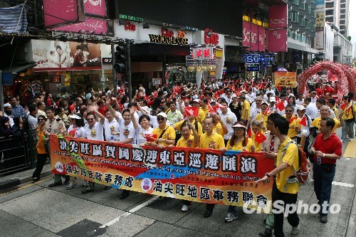 九月二十日,为迎接国庆六十周年及首次主办东亚运动会,香港各地区举行了各种庆祝活动。图为香港油尖旺区贺国庆迎东亚运巡游汇演。中新社发 郑祚声 摄