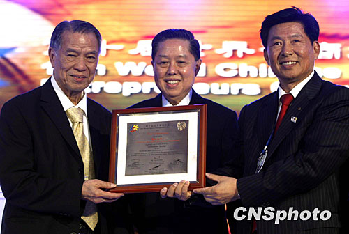 11月20日,第十届世界华商大会高峰论坛在菲律宾首都马尼拉举行,大会主席陈永栽(左)向中国远洋运输集团总裁魏家福(右)颁发荣誉证书。中新社发 张宇 摄