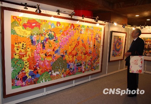12月15日,河南省民俗艺术展暨河南农民画展在台北圆山大饭店开展。图为一名河南籍老台胞正在聚精会神观看展出作品。中新社发 陈立宇 摄
