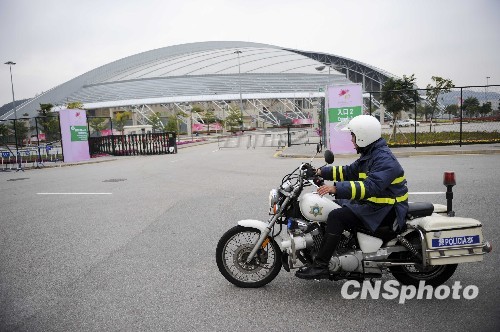 12月17日,警察在澳门东亚运动会体育馆外值勤。随着澳门回归十周年庆典活动的临近,活动场地澳门东亚运动会体育馆加强了安保戒备。中新社发 廖攀 摄