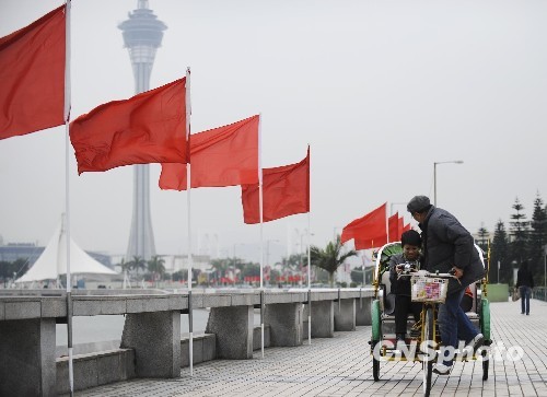 12月18日,澳门南湾大马路上插起红旗迎接回归十周年庆典,吸引不少民众拍照留念。中新社发 廖攀 摄