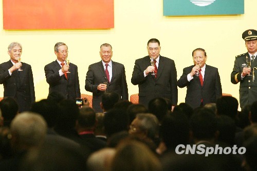 12月20日下午,澳门特区政府在观光旅游塔举行“庆祝特区政府成立十周年酒会”,刚刚宣誓就职的特区行政长官崔世安、卸任行政长官何厚铧等出席。中新社发 洪少葵 摄
