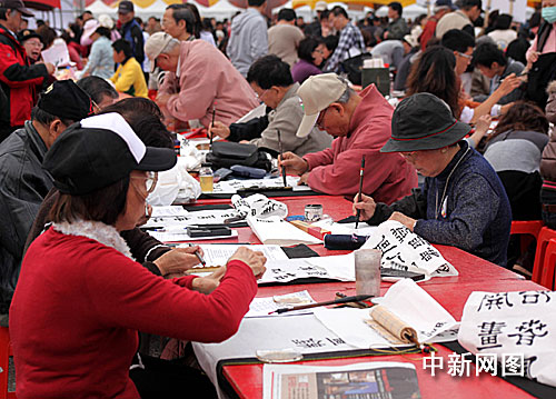 1月1日,台北市在“中正纪念堂”举行“第六届汉字文化节、汉字潮文化根”新春开笔万人挥毫活动。图为不少老人家踊跃参加挥毫。中新社记者 陈立宇 摄