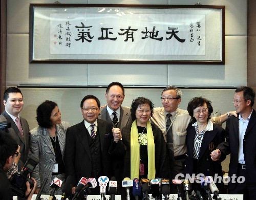 香港高等法院2日就已故香港华懋集团主席龚如心的千亿港元遗产案作出裁决,判华懋慈善基金一方胜诉。龚如心家人召开记者会,龚如心胞弟龚仁心、华懋集团主席龚仁心(右三)表示,遗产案判决体现天地有正气,相信龚如心在天之灵也会笑。中新社发 谭达明 摄