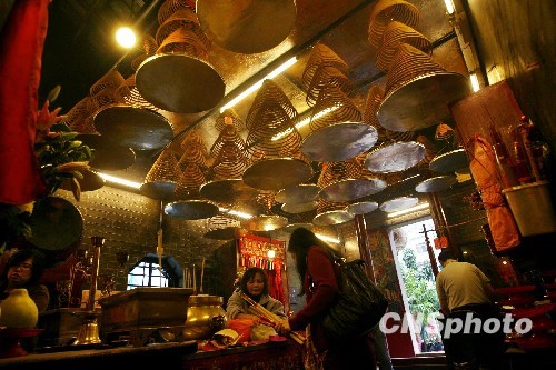 2月2日,经各机构努力,香港塌楼事件所在街道供电、供水等已逐步恢复正常。图为信众在一度因停电关门的马头围道“北帝古庙”上香敬神。中新社发 郑祚声 摄