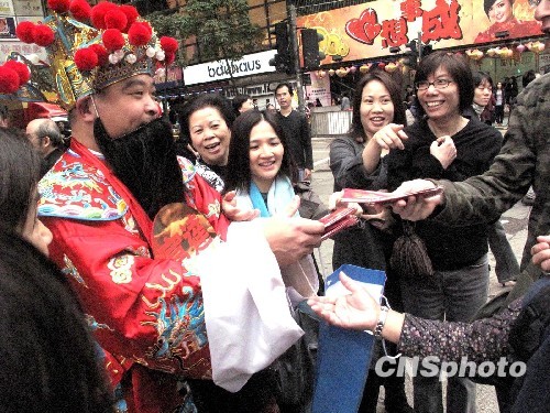 新年将至,“财神爷”在香港繁华街头向市民派发“利是”封,呈现迎新年的欢乐喜气。中新社发 张勤 摄