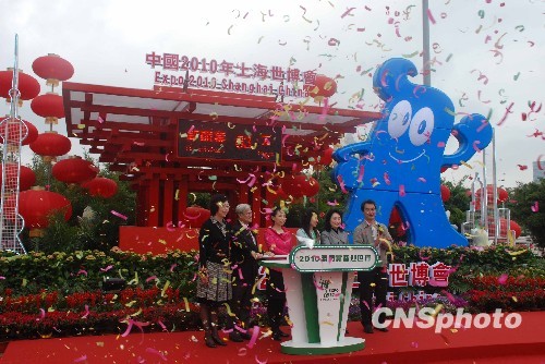 澳门特区政府2月27日下午在澳门西湾湖广场举行“新春迎世博活动”,启动了大型世博计时景观,一批吉祥物“海宝”的雕塑也开始在澳门主要景点安放。中新社发 毕永光 摄