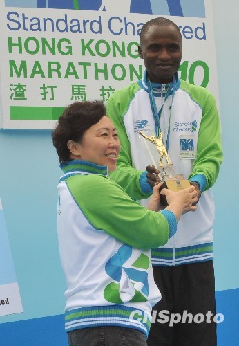 2月28日上午,香港举行2010年渣打马拉松赛,非洲肯尼亚选手莫比(Cyprian Kiogora Mwovi)夺得全程42公里男子组总冠军。图为香港运输及房屋局局长郑汝华担任颁奖嘉宾,为夺成功卫冕冠军的肯尼亚选手莫比颁奖。中新社发 邓庆乐 摄