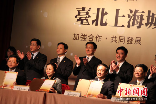 4月6日下午,在首度访台的上海市长韩正(后排右2)、台北市长郝龙斌(后排右1)的见证下,两市签署文化、旅游、环保、科技园区交流合作4项备忘录。中新社发 董会峰 摄