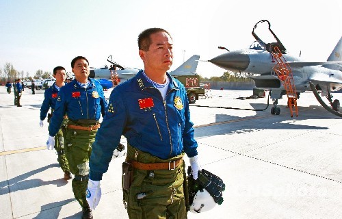 11月上旬,为庆祝人民空军成立60周年,空军将安排空军八一飞行表演队和空军跳伞运动大队向社会进行飞行和跳伞表演。图为10月31日,八一飞行表演队所在师师长严锋(前一)带领歼10表演飞行员走向飞机准备训练。中新社发 谭超 摄
