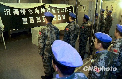 1月19日傍晚,从各施工点返回营区的中国第三批赴苏丹达尔富尔维和工程兵大队官兵,面向海地牺牲的8名维和警察遗像默哀、献花,表达自己的缅怀之情。中新社发 肖丹 摄