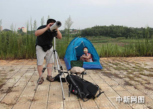 七点刚过,来自南京的一位父亲带着儿子,就在安徽铜陵乌木山广场附近,调试设备,据了解,昨夜他们就在路边帐篷度过一夜。儿子称,怕迟到错过日出,在帐篷里等待比较踏实。中新网发 记者 吴兰 摄