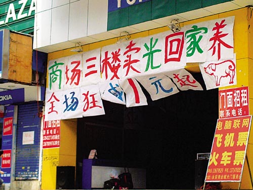 近日,深圳市宝安区一大型服装百货商场打出雷人广告“商场三楼卖光回家养猪”。(小康)