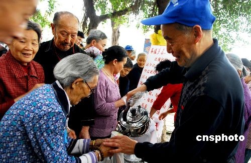 2009年5月12日下午,四川南充市高坪区清溪路社区曾参加过抗美援朝战争和汶川大地震抗震救灾的老英雄杨兴海和老伴张玉琼,在街头向市民免费发放馒头、花卷和绿豆汤,纪念“5·12”一周年。中新社发 邱海鹰 摄