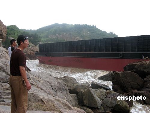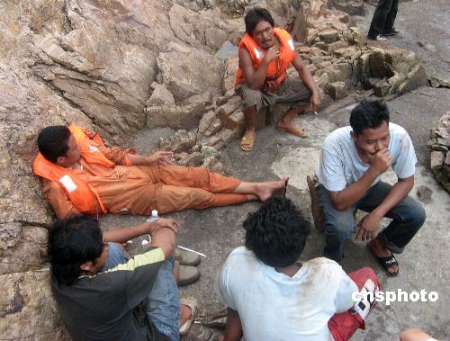 6月22日,受今年第3号热带风暴“莲花”外围影响,印度尼西亚籍货轮“永昌11号”在浙江洞头海域避风时遇险,后漂流到洞头鹿西岛,5名船员被当地边防民警、村民营救上岸。这艘遇险的外轮为驳船,船号为“永昌11号”,吨位为1000吨,其拖船为“LINTAS SAMUDERAXVI”,其驳船和拖船上共有10名船员,均为印度尼西亚籍船员。中新社发 蔡宽元 摄
