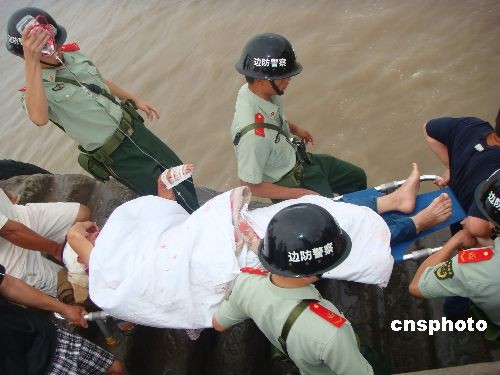 6月25日,浙江温州市鹿西岛一渔民因踩到青苔摔入5米高的山沟,造成头部重伤,处于昏迷状态。接警后,鹿西边防派出所官兵立即赶赴现场救援,将受伤渔民抬至乡卫生院简单包扎后,迅速安排快艇送往洞头县人民医院进行救治。由于抢救及时,受伤渔民已脱离危险。中新社发 吴水斌 摄