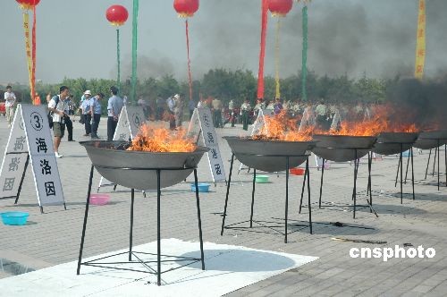 6月26日上午,陕西咸阳统一广场,数百公斤毒品被当场销毁。当天,陕西省禁毒委员会在咸阳举行公开销毁毒品大会,集中销毁缴获的313公斤毒品。中新社发 赵钊 摄