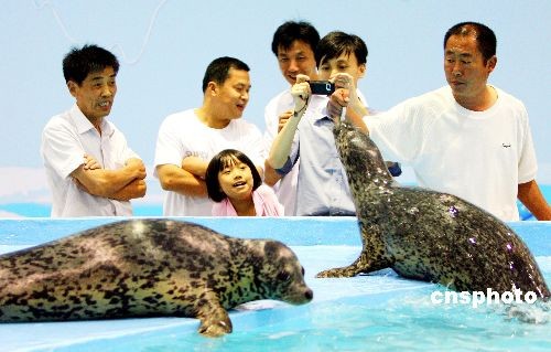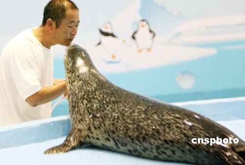 2009年7月7日傍晚,首批4只斑海豹从大连圣亚极地世界出发,乘坐飞机抵达苏州市高新区白马涧生态园。它们将与王企鹅、白眉企鹅、北极狼、北极狐等数十只极地“动物明星”一起参加自7月10日起为期两周在该市举行的“2009第四届白马涧冰雪狂欢节”展示与表演活动。中新社发 王建中 摄