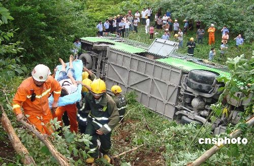 7月7日17时许,广西玉林北流市发生大客车侧翻事故,玉林市消防支队北流大队官兵闻警出动,成功转移救助33名乘客。中新社发 张希友 摄
