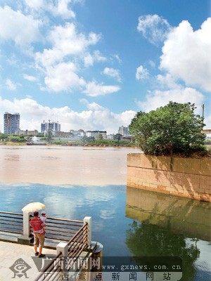 7月8日,随着南宁市今年第一次洪峰的逐渐消退,市民发现邕江竟然出现了黄色和黑色非常分明的“鸳鸯江”景象