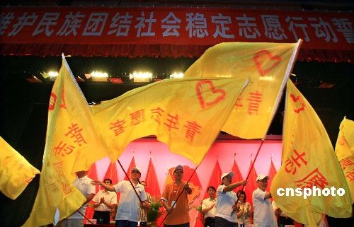 7月15日,新疆乌鲁木齐市举行“维护民族团结社会稳定志愿行动誓师大会”。截至目前,该市已招募志愿者3700余名,主要承担医务护理及心理抚慰等善后工作。中新社发 刘新 摄