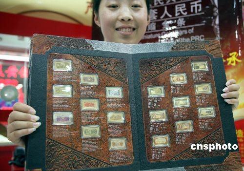 7月16日,工作人员展示“中华人民共和国第一套人民币微缩金条”。该金条采用620克纯金打造,将中华人民共和国发行的第一套法定国家货币12种面额、62种版别的图案微缩再现于62枚金条之上,是国家货币贵金属收藏品中难得的珍品,全球仅限量发行8000套。中新社发 赵隽 摄