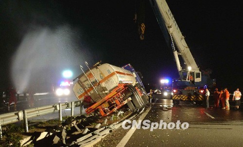 2009年7月21日,消防队员在处理事故现场。当日零晨1点20分,江苏宁淮高速公路淮安路段发生一起交通事故。一辆挂有皖C牌照,装满化学原料苯的灌装车,在行驶中撞到左侧的隔离桩,造成侧翻。据了解,事故未造成化学品泄漏和人员死亡。3小时后交通恢复正常通行。中新社发 水从泽 摄