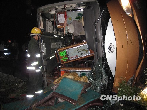 7月26日晚,广西南梧二级公路桂平市石咀镇路段发生一起大客车翻车事故,共造成1人死亡多人受伤。经过桂平消防官兵40多分钟的紧张施救,车上两名被困者被救出,而此前已有多名伤者被送往医院救治。事故初步判定为雨天路滑所致。中新社发 杨文福 摄
