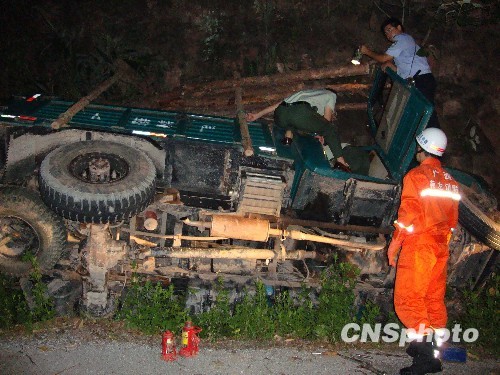8月9日晚,广西崇左宁明往爱店方向,一辆载满木头的大货车发生侧翻,造成3人受伤,其中司机被困驾驶室内无法动弹。宁明县消防官兵接警后迅速前往救援,最终成功救出司机。中新社发 彭会娟 摄