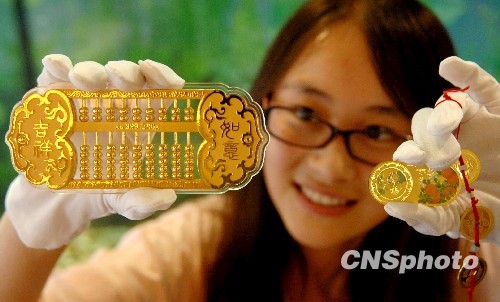 由中钞国鼎有限公司发行的吉祥如意金算盘将于8月18日在中国银行、中钞国鼎直营店预售。据介绍,吉祥如意金算盘采用999纯金材质,集合镜面、喷砂、浮雕、油压、倒模等高精工艺铸造而成,共分18克、88克、188克和588克四种规格,限量发行。8月14日,工作人员展示即将上市的金算盘。中新社发 远舟 摄