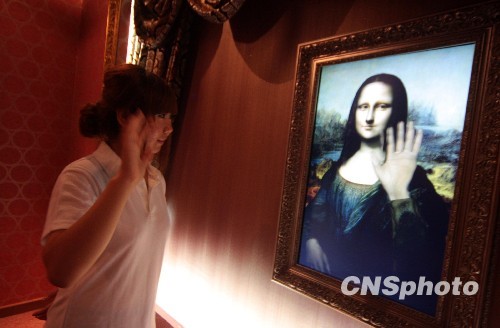 8月15日,蒙娜丽莎“开口说话”并与工作人员打招呼。当日,世界经典艺术多媒体互动展在北京城市规划展览馆开幕,全息影像技术、3D与语音互动技术,使世界经典艺术作品中的人物复活,不仅能开口说话,还能挥手致意。中新社发 吴芒子 摄
