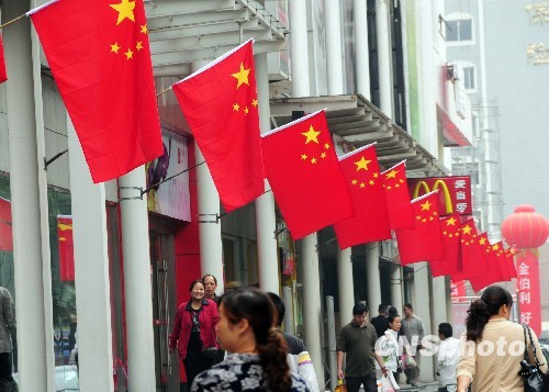 临近国庆,河南省洛阳市很多商店门前纷纷挂上国旗,喜迎建国60周年,鲜红的国旗为古都洛阳增添了喜庆的气氛。中新社发 振华 摄