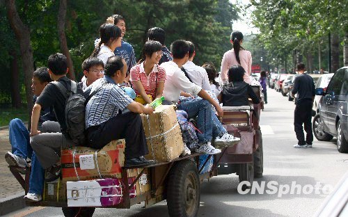 9月9日,人民大学新生报到,运送行李的拖拉机上坐满了家长和学生。中新社发 苏丹 摄